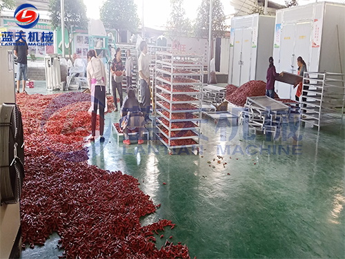 辣椒烘干機(jī)的出現(xiàn)為用戶解決了辣椒產(chǎn)業(yè)中較大的發(fā)展瓶頸,有益解決了辣椒烘干難的問題。新疆辣椒烘干機(jī)采用熱風(fēng)爐供給熱風(fēng),提高烘干速率20%-30%,辣椒成品、顏色、干度、品相、能耗都令人滿意,不但衛(wèi)生,而且大幅度地提高烘干產(chǎn)量,辣椒品質(zhì)得以增幅,取得了顯著的經(jīng)濟(jì)效益,因產(chǎn)量擴(kuò)大,從而再次加機(jī)以滿足烘干需求。